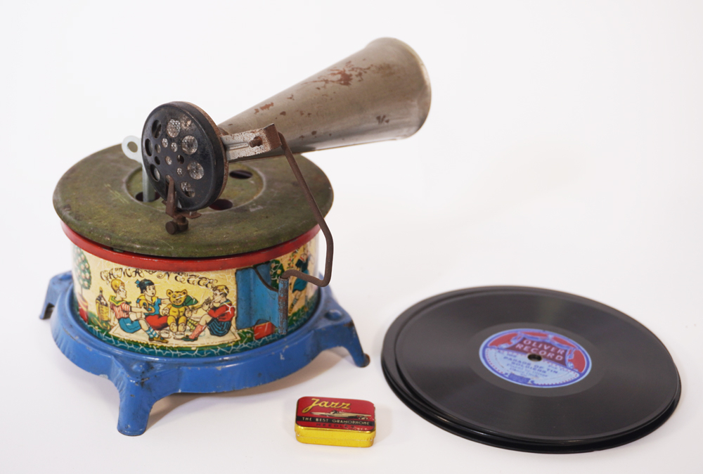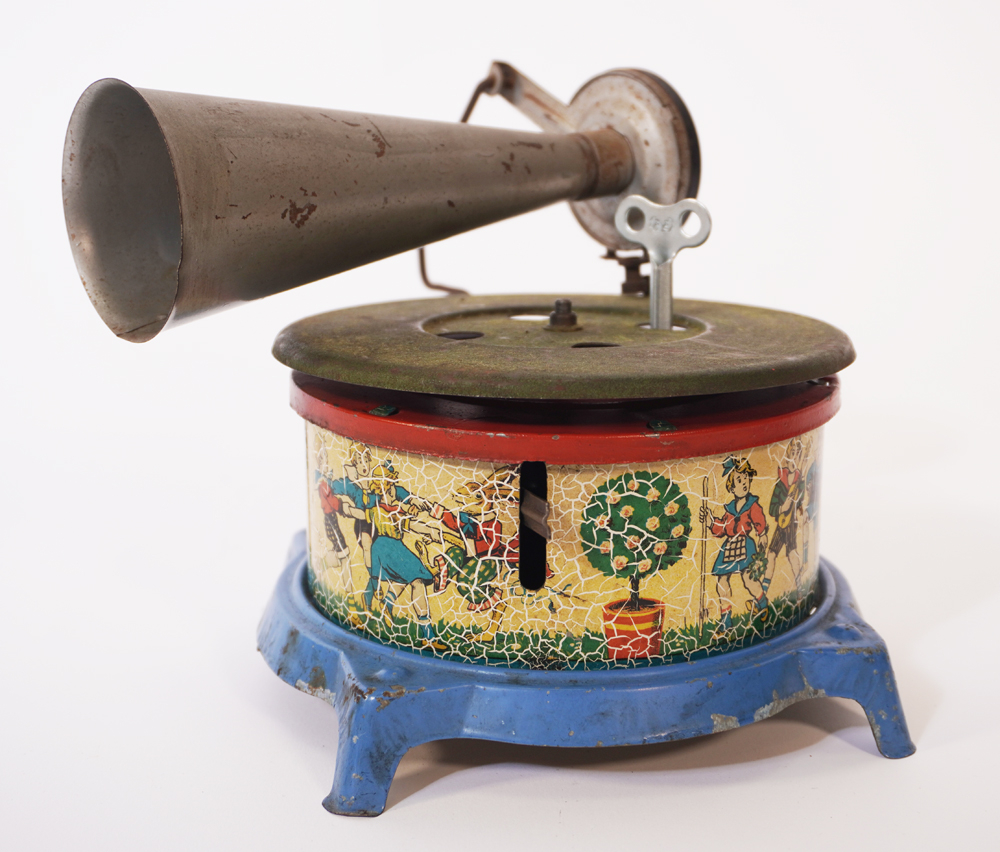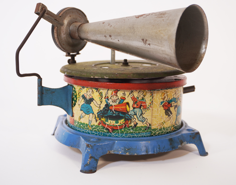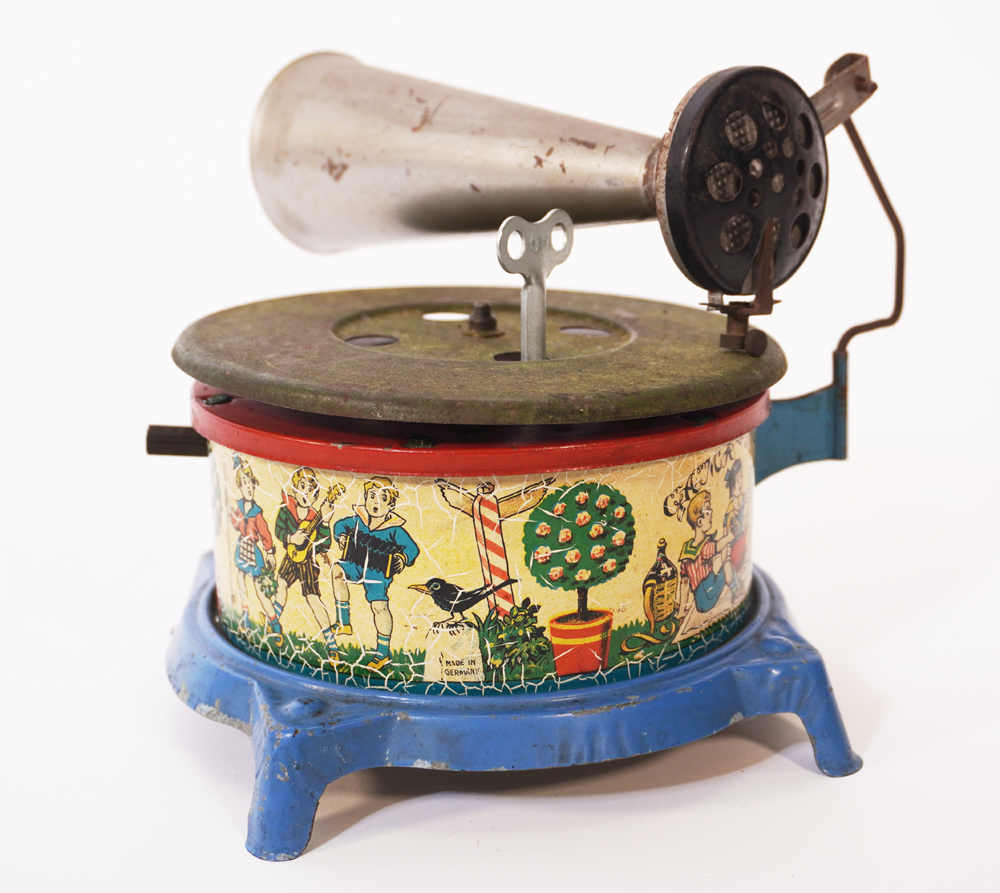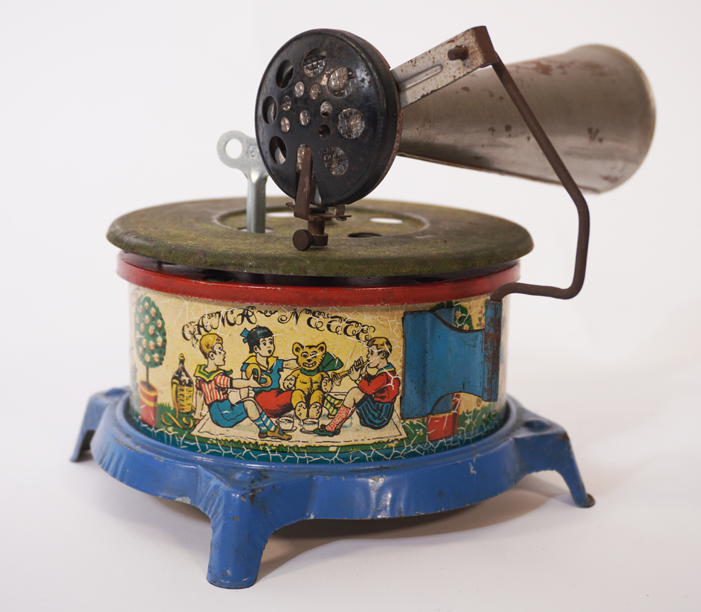 Aangeboden wordt een grappige blikken speelgoed kinder grammofoon van het merk Gama. Gemaakt in Fürth Duitsland rond 1930. Deze blikken grammofoon is rondom versiert met grappige figuurtjes. Ondanks zijn hoge leeftijd speelt deze grammofoon nog. Een 4-tal plaatjes en een doosje naalden worden meegeleverd.